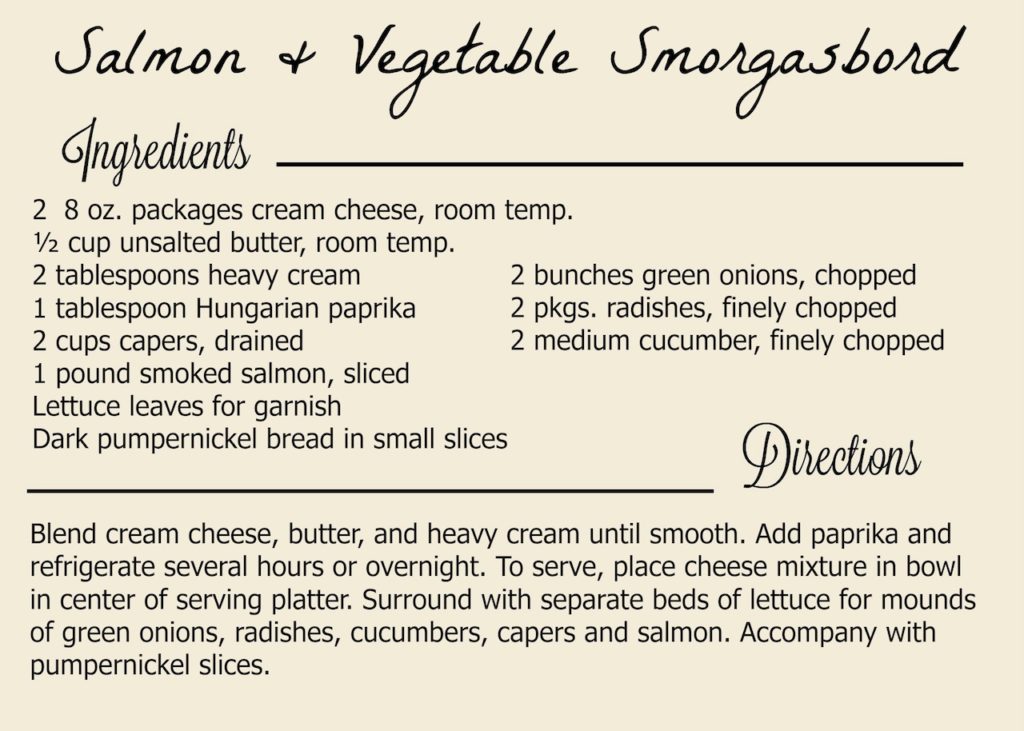 May 6, 2017, posted by Gina – This is the third in a series of posts about a recent garden party luncheon I hosted. Earlier this week, I took you on a tour of the garden and the patio where my guests enjoyed an appetizer and champagne bar. I also posted a tutorial showing how to make the rose pavé centerpiece for the main table. Today, I’m sharing the menu for the luncheon with you and a recipe for Salmon and Vegetable Smorgasbord.