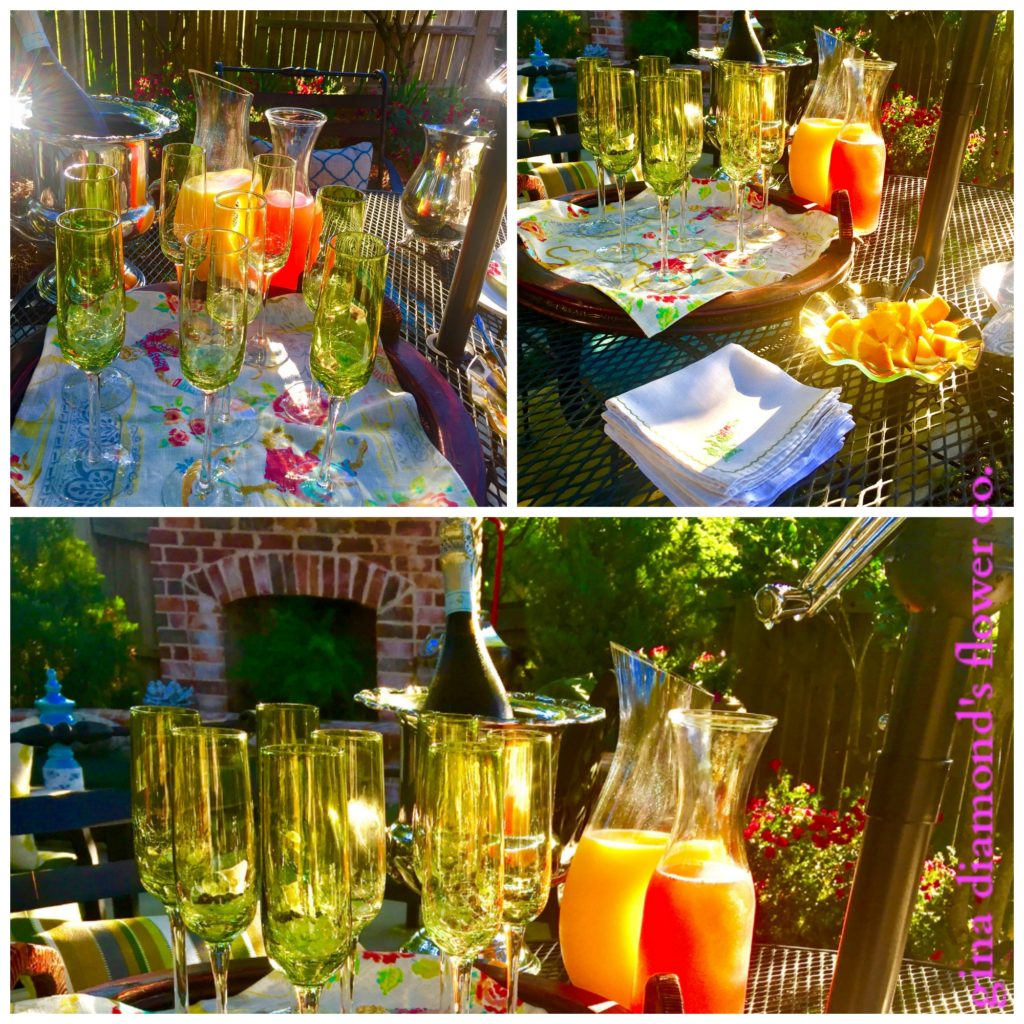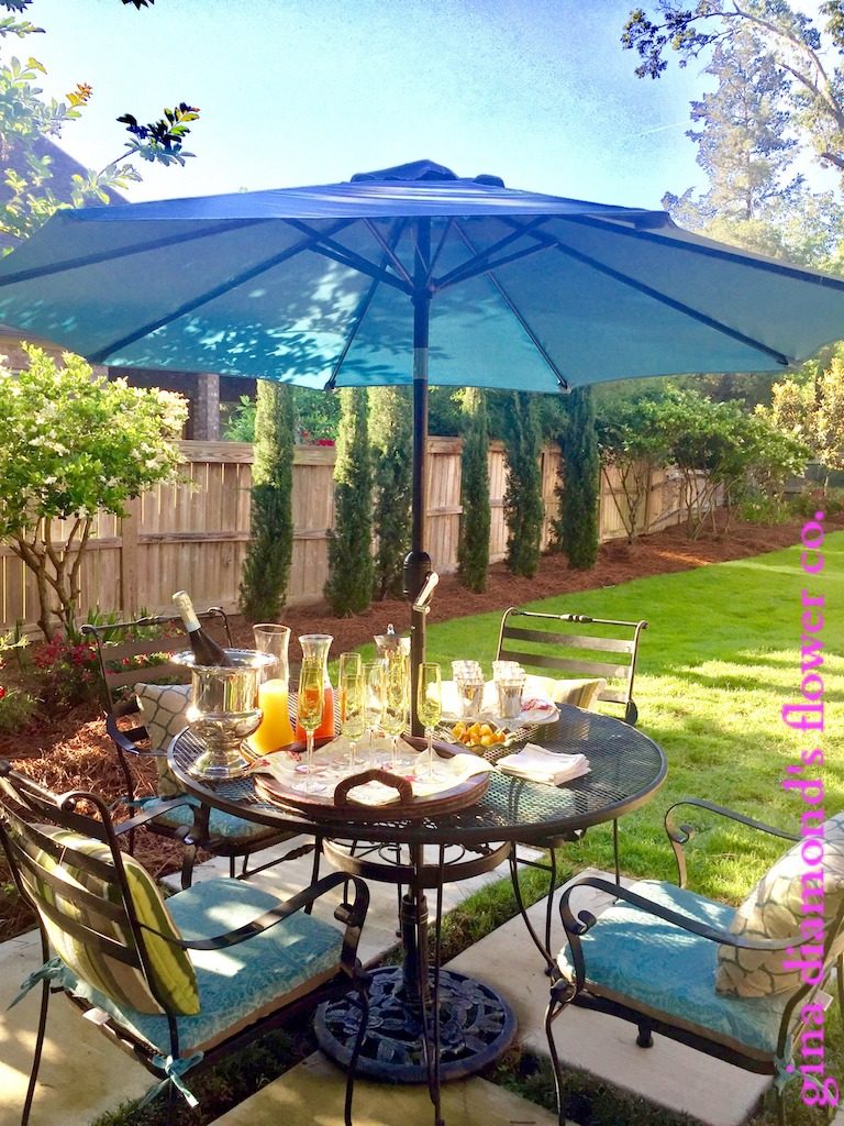 May 3, 2017, posted by Gina – I hosted a garden party luncheon this week and I am so excited to take you on a tour of the day. I’ll share details about the tablescapes, the flower arrangements, the patio, the garden and, of course, the food! This post is all about the outdoor aspects of the luncheon. I’ll show you around the patio and the champagne bar where a very special tea, an appetizer and of course, champagne were served. We’ll also take a look around the backyard and garden areas. I’ll post about the flowers arrangements, the tablescape and the food in the coming days. Here we go….