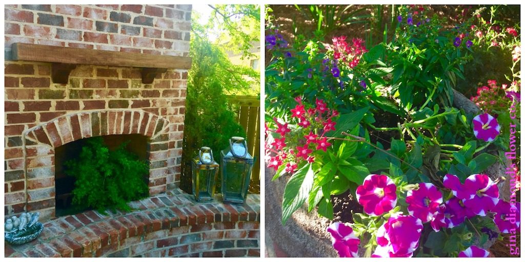 Here you see my patio fireplace that I livened up with an asparagus fern which looked much prettier with this fluff of green in it. The planter on the right is filled with pinks and purples just seems to scream spring. Petunia, verbena and Angelonia are all happy together.