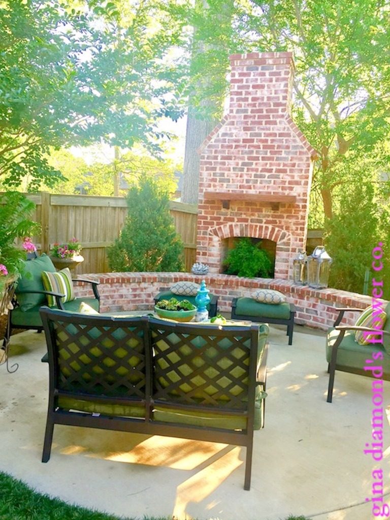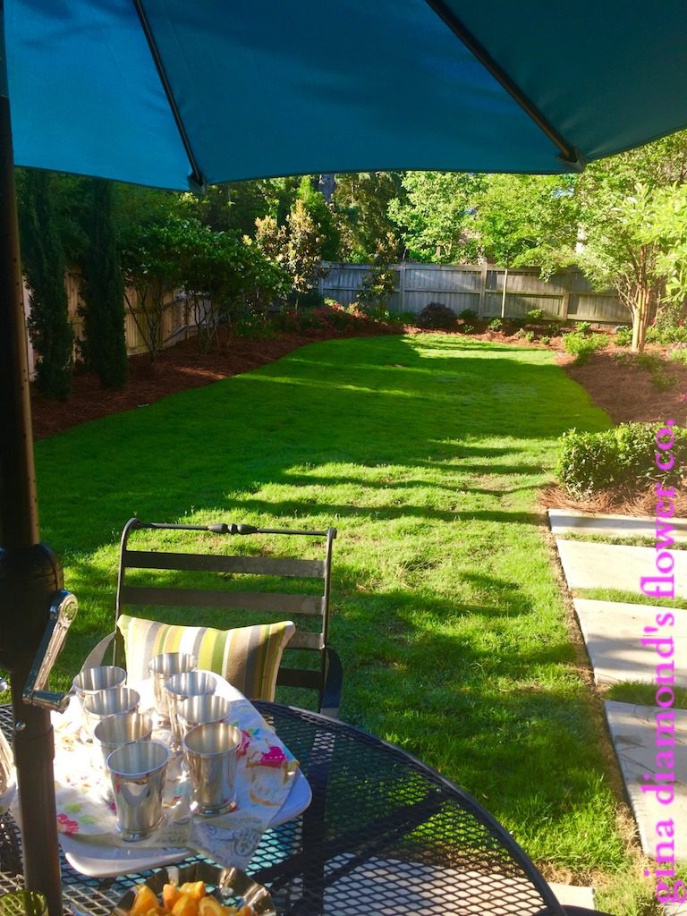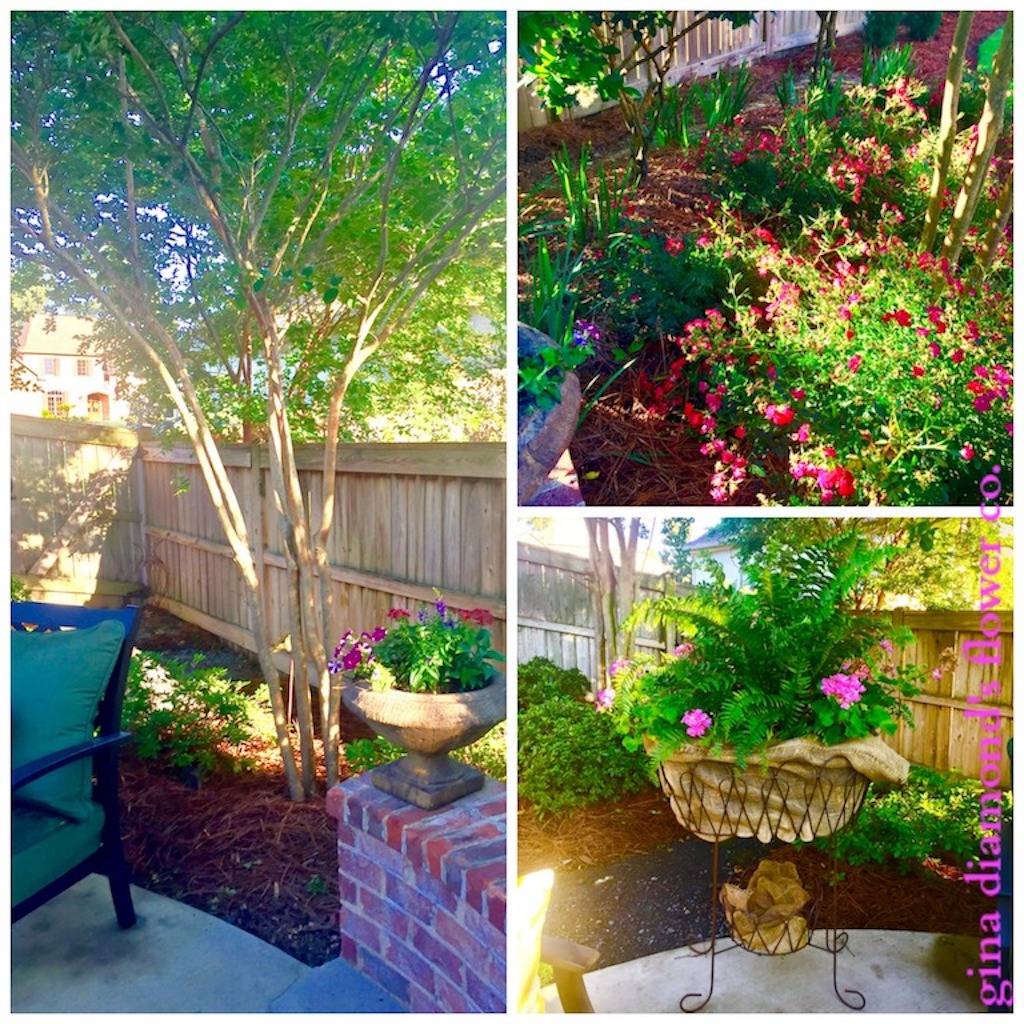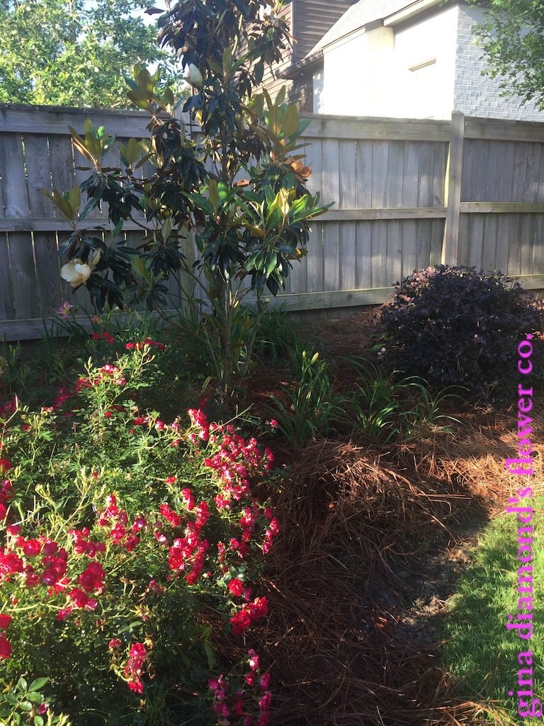 The square stones below are what you’d see if you turned to look the other way. Many people ask me if these stones were simply laid on the ground but they were poured and so there they shall stay. There is Mondo grass between the stones and to the left is a bed of azaleas, sweet bay magnolias and camellias. All of this was blooming a beautiful hot pink not too long ago. On the right side of the photo you’ll see the infamous flower bed that caught on fire. Yes, before we had proper patio and backyard lighting, we placed tiki torches around for a party. Five minutes before our guests were to arrive, Mr. GDFC smelled smoke and realized one of the torches had fallen over and started a fire. We both ran outside like lightening and grabbed hoses and put the fire out. So, if you notice these plants being a bit smaller than the rest, you are correct. Believe it or not, we pulled ourselves together before the first guest arrived. We still get a chuckle about this while being very thankful we caught it in time.