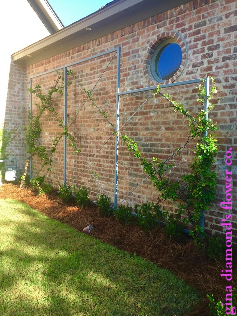 This trellis was custom built for this wall and the confederate jasmine is about to take off. I look forward to the day it is full of leaves and blooms.