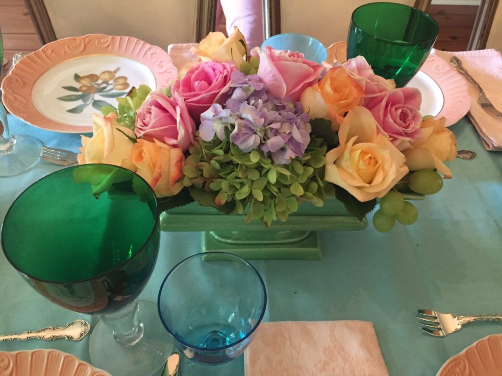 The rose you see in this arrangement was actually made from ribbon. I watched intently but am still not sure I can master this just yet. Practice makes perfect, right?