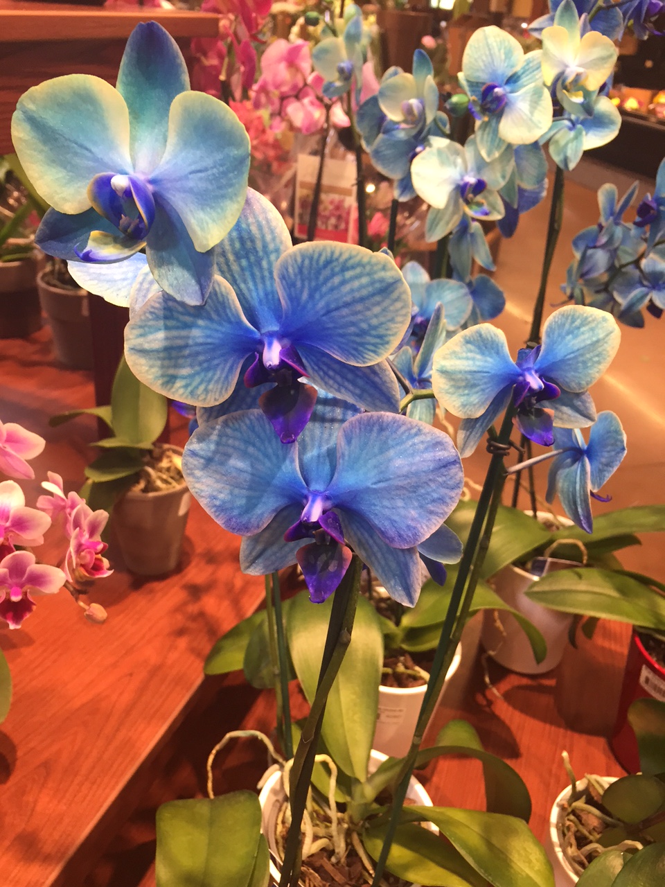 First, I saw the multicolored hydrangeas garishly sporting hues that are not naturally occurring. Then I turned the corner and saw the BRIGHT BLUE orchids. I think I audibly gasped!