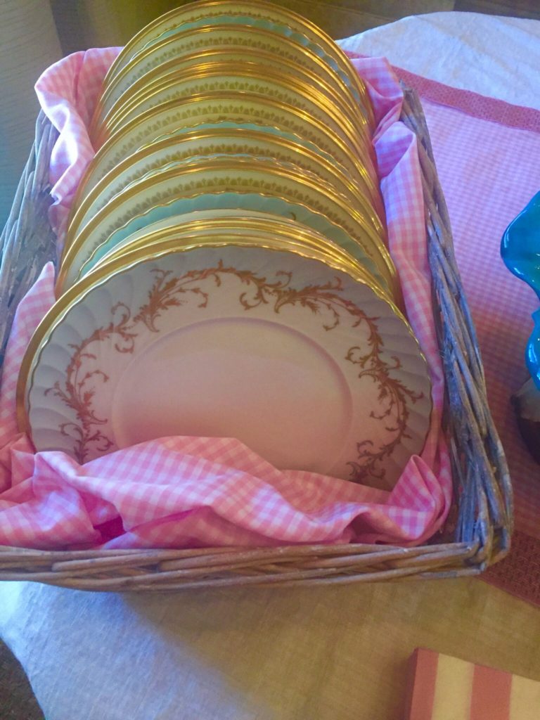 I alternated three china patterns in this basket lined with pink and white gingham.