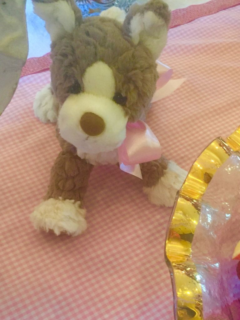 This precious little stuffed dog gave the table a sweet bit of charm. I tied a pink bow on him and let our Mom to Be take him home for the nursery.