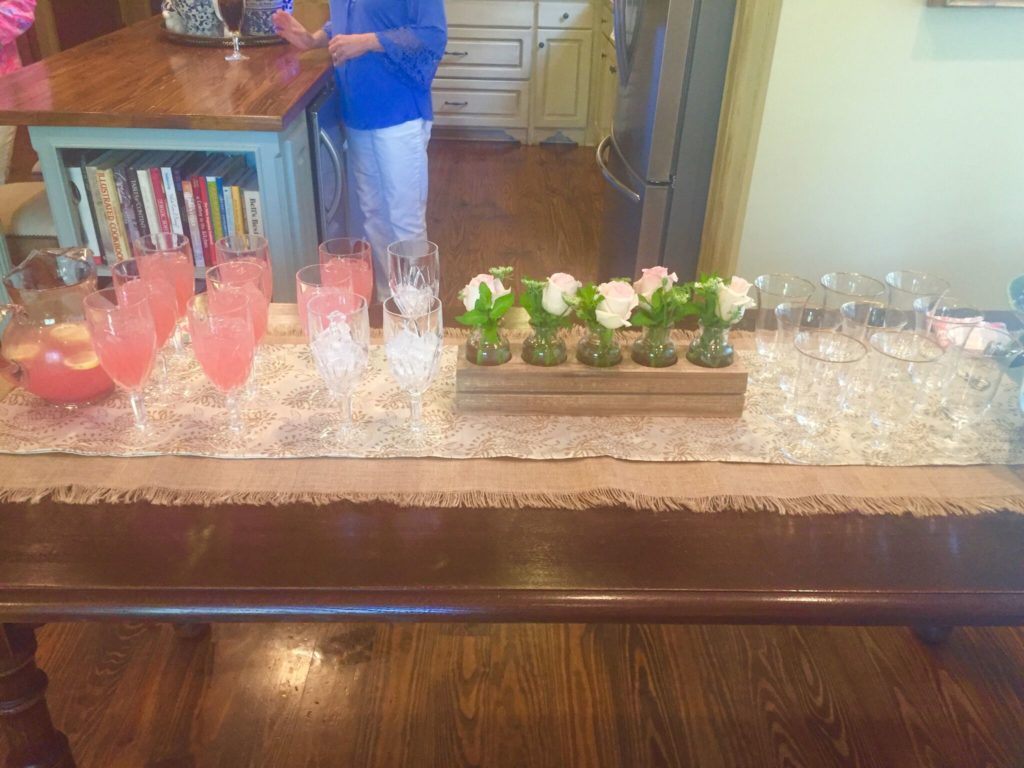 We served pink lemonade, water and soft drinks. Look at the cute vessel for the roses in the middle of the table. My son and daughter-in-law gave this to me for Christmas. I received several comments on it.