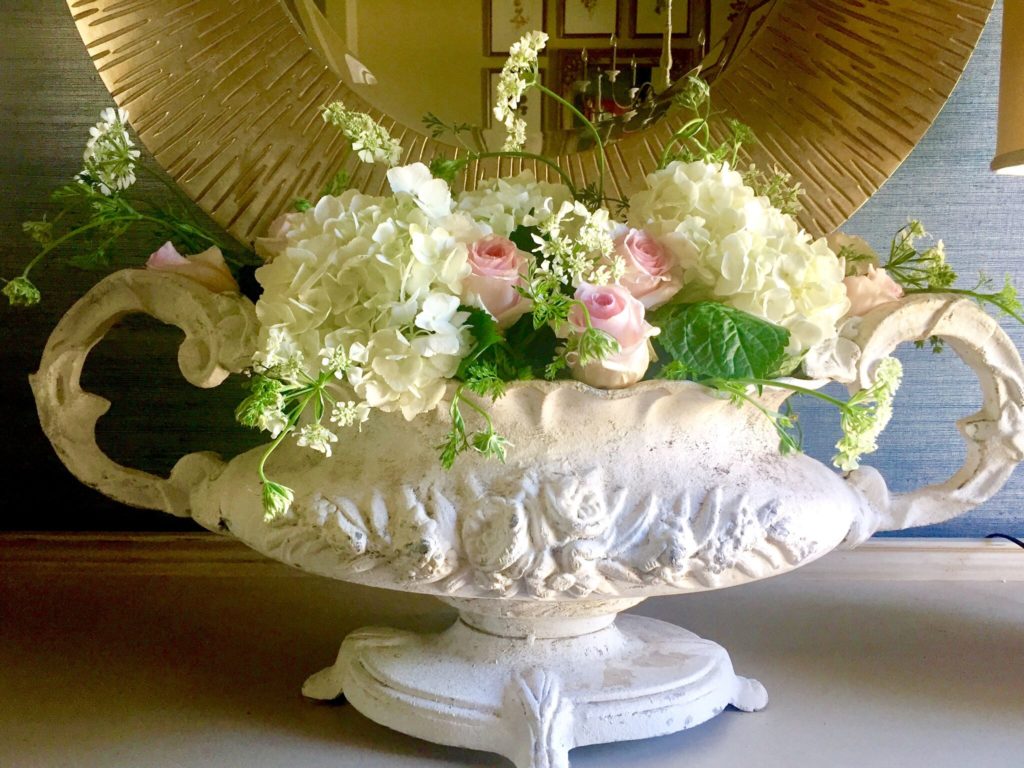 I really wanted to use the softest pastels in this arrangement and chose hydrangeas and pale pink roses to use in this large cast iron planter.