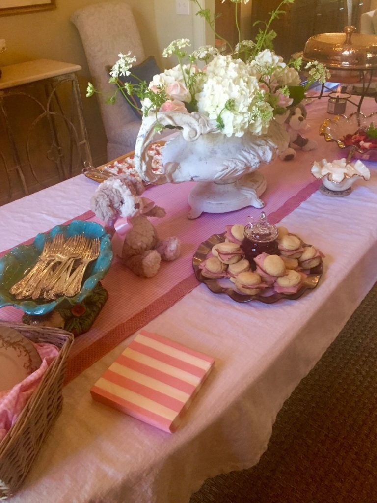 Below is a full view of the table. We used pink and white striped napkins, a gingham table runner, and Annie Glass serving pieces all on top of a light cream tablecloth.