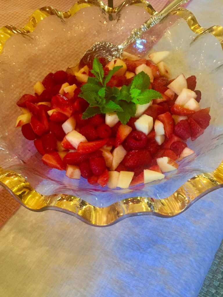 Fruit Salad with Marshmallow Cream Dip (GET RECIPE). I used strawberries, raspberries and honey crisp apples tossed with lemon juice and a sprinkle of sugar and served it with Marshmallow Cream Dip. This dip may sound a bit lame but trust me when I tell you everyone wanted to know how to make it. I had it a few years ago at a garden club meeting and asked for the recipe. I had never purchased the marshmallow cream in my life, but I am won over by it.