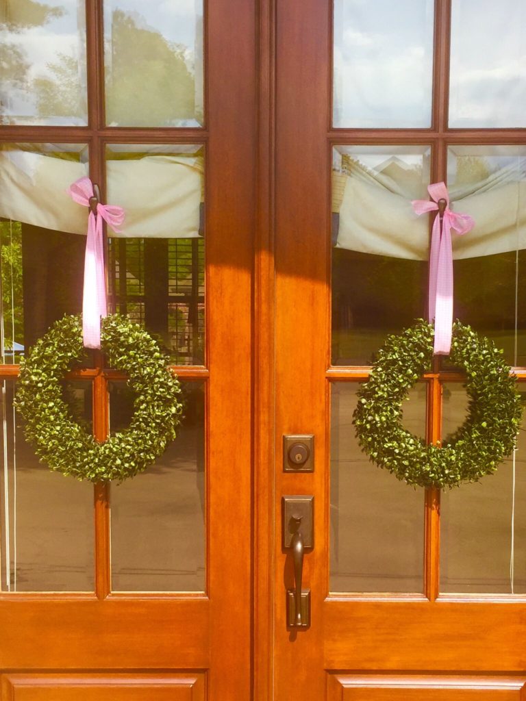 I tied simple pink and white gingham ribbon on boxwood wreaths to welcome our guests.