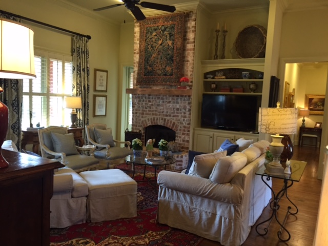 These two photos above are the before and after of our family room. Huge difference! We did a few very simple things like removing the lower shelving in the built-in to make room for the flatscreen, added a mantle above the fireplace and hung a large tapestry to break up the brick, had custom drapes made and placed the furniture in a more inviting and cozy arrangement.