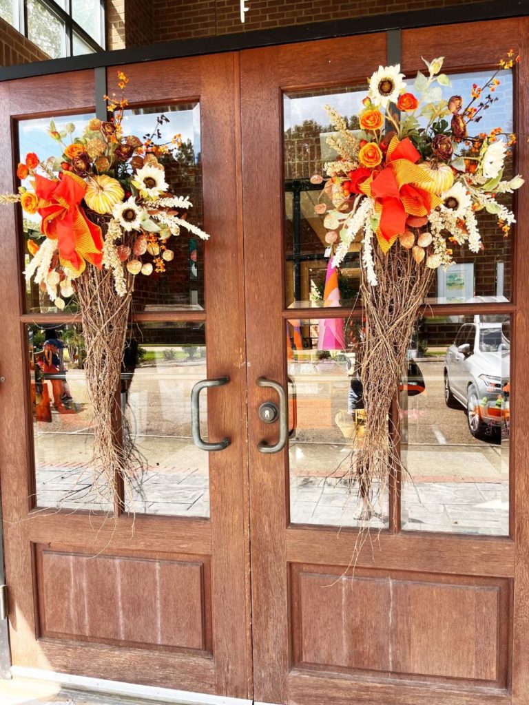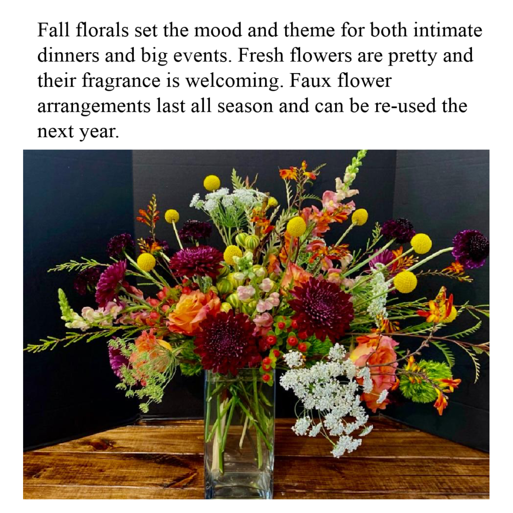 Let us create a dramatic statement for your next gathering with our beautiful fresh or faux floral arrangements. Centerpieces, accent arrangements, door décor, wreaths and more.