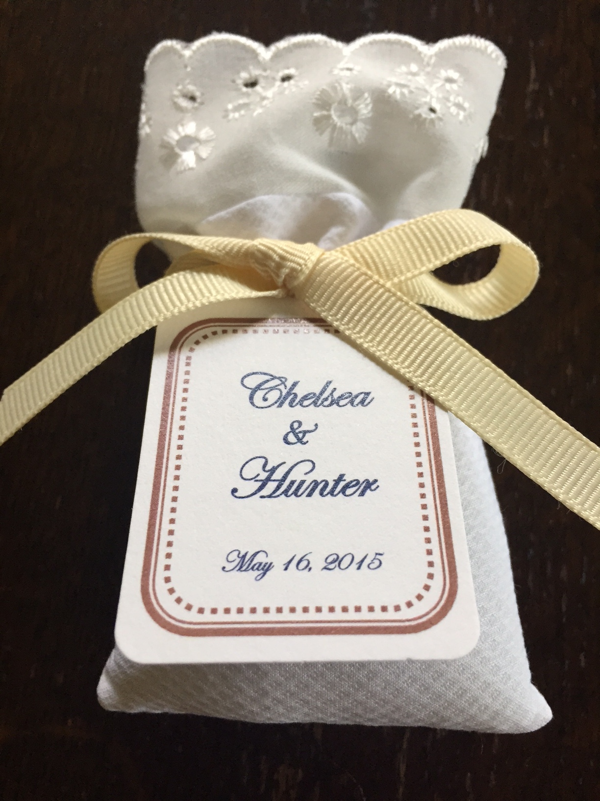 At each place setting there was an eyelet sachet filled with lavender and a tag with the bride and groom’s names and the wedding date printed on it. (source: Flying Little Birds shop on Etsy, these were handmade and just beautiful)