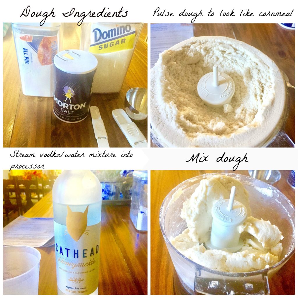 Combine flour, salt and sugar in food processor and pulse 10 times. Add frozen butter and process until mixture resembles cornmeal. Combine water and vodka. With food processor on, let liquid stream into dough mixture until combined. Place food processor bowl in freezer for 15 minutes.