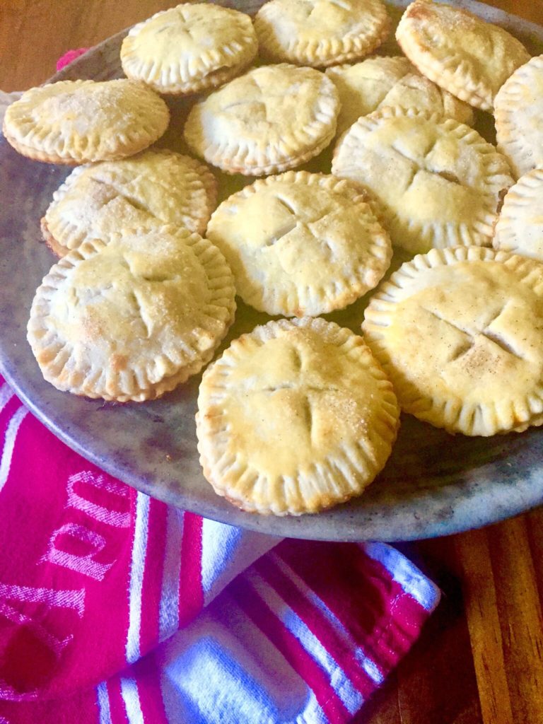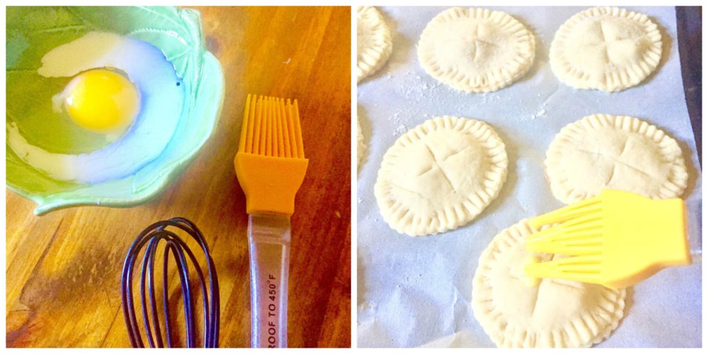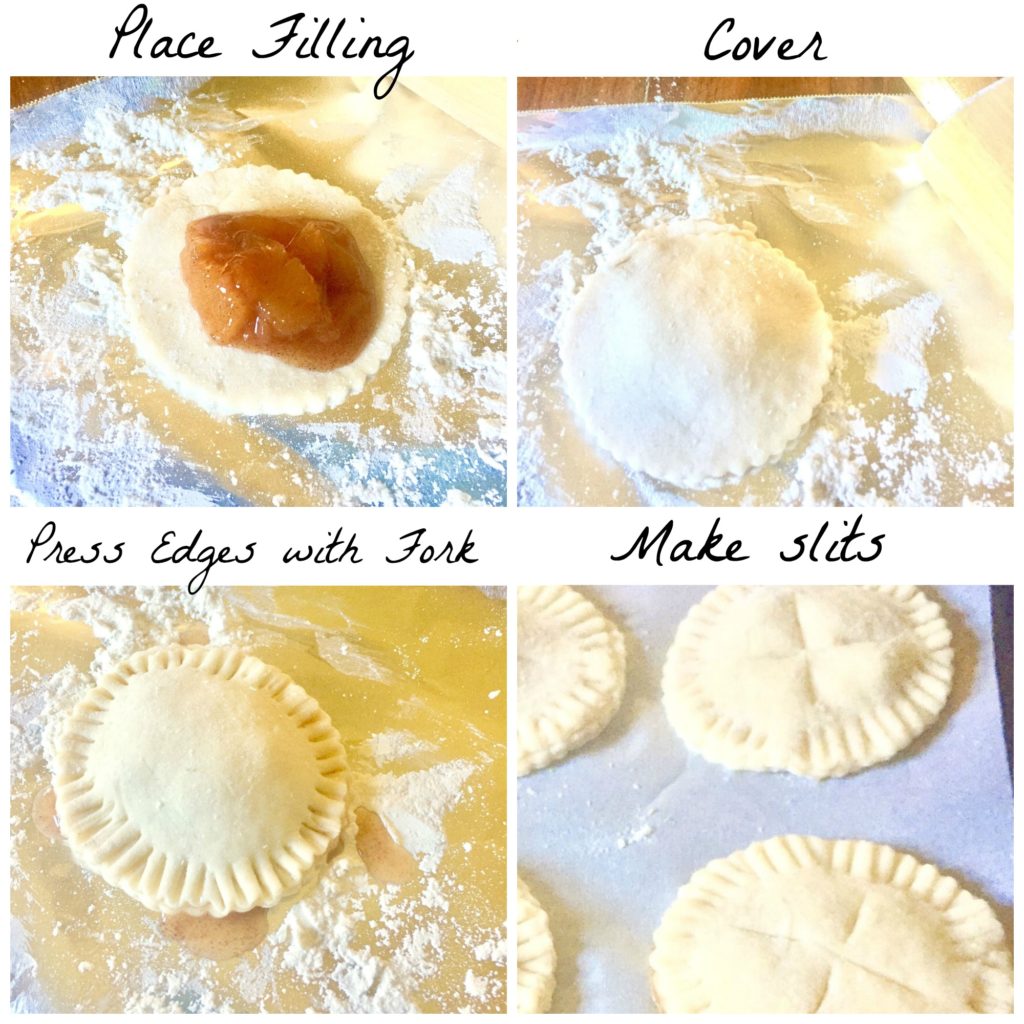 To assemble, top one of the 3-inch circles with the peach filling then top with another 3-inch circle of dough. Press edges together with a fork to seal. Place 3 – 4 slits in each pie.