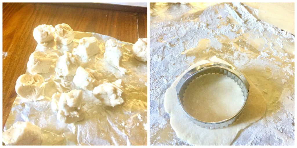 After 15 minutes, divide dough into 12 equal portions. Shape each dough portion into a ball. Roll each portion to a 5-inch circle. Cut dough with a 3-inch biscuit cutter.