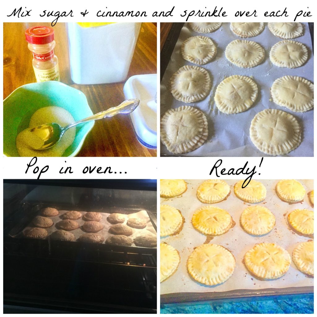 Combine sugar and cinnamon and sprinkle over each pie.