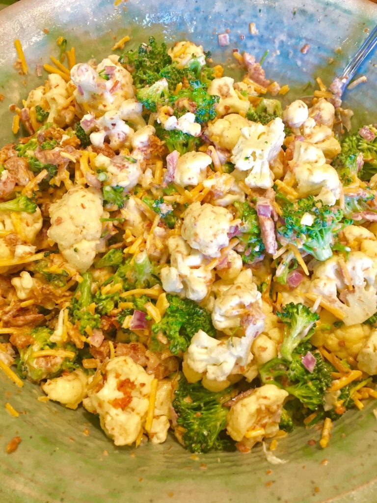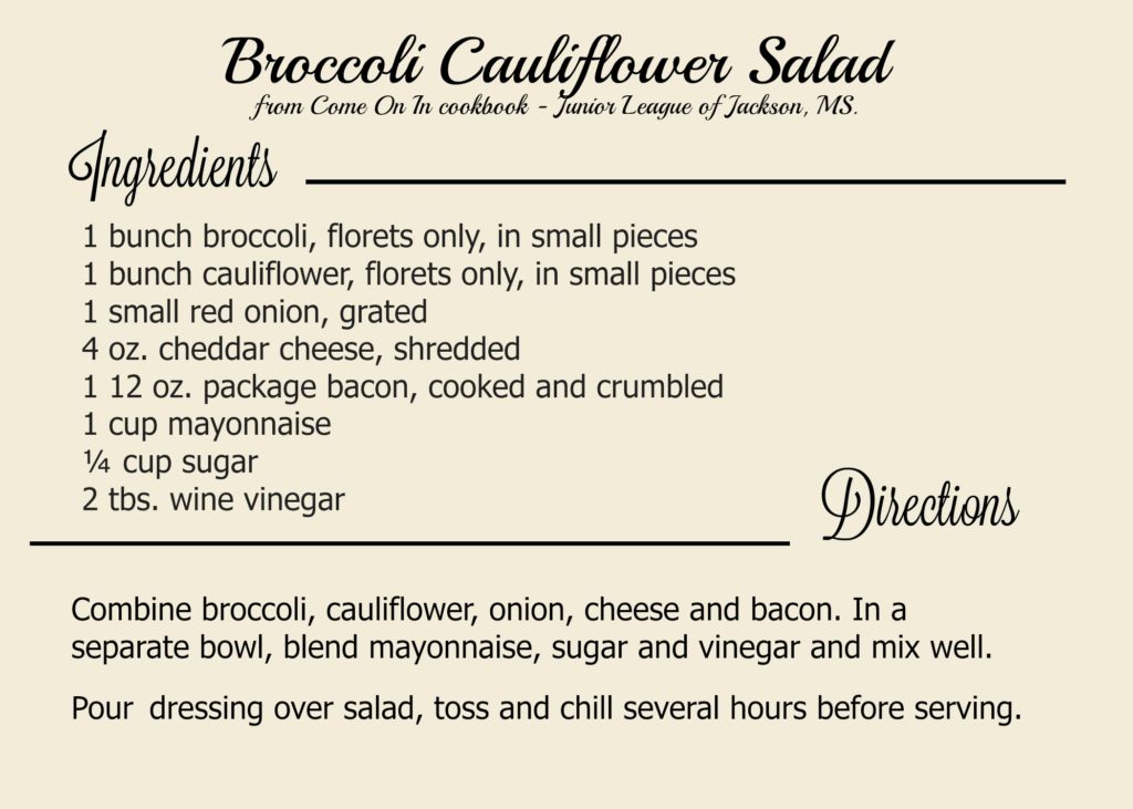 Broccoli Cauliflower Salad from Come On In, Junior League of Jackson, MS. For some reason, I love to make this salad in the warmer weather months and Easter certainly ushers in warmer weather in my neck of the woods. This salad has a sweet and savory taste and is great with any type of meat.