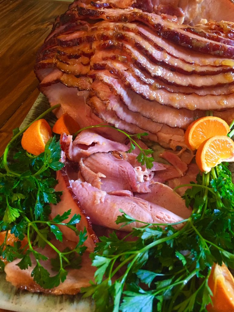 I am preparing two main dishes, Baked Virginia Ham and Lamb Chops. Years ago, one of the hostesses for my cookbook club prepared this ham from The Barefoot Contessa Cookbook. The sauce really makes it special. Surround the ham with parsley or other herbs and slices of oranges and lemons and you will look like a pro! As for the lamb chops, I simply salt and pepper them…nothing fancy as they are so good just as they are. Sometimes I roast them and other times I grill them.