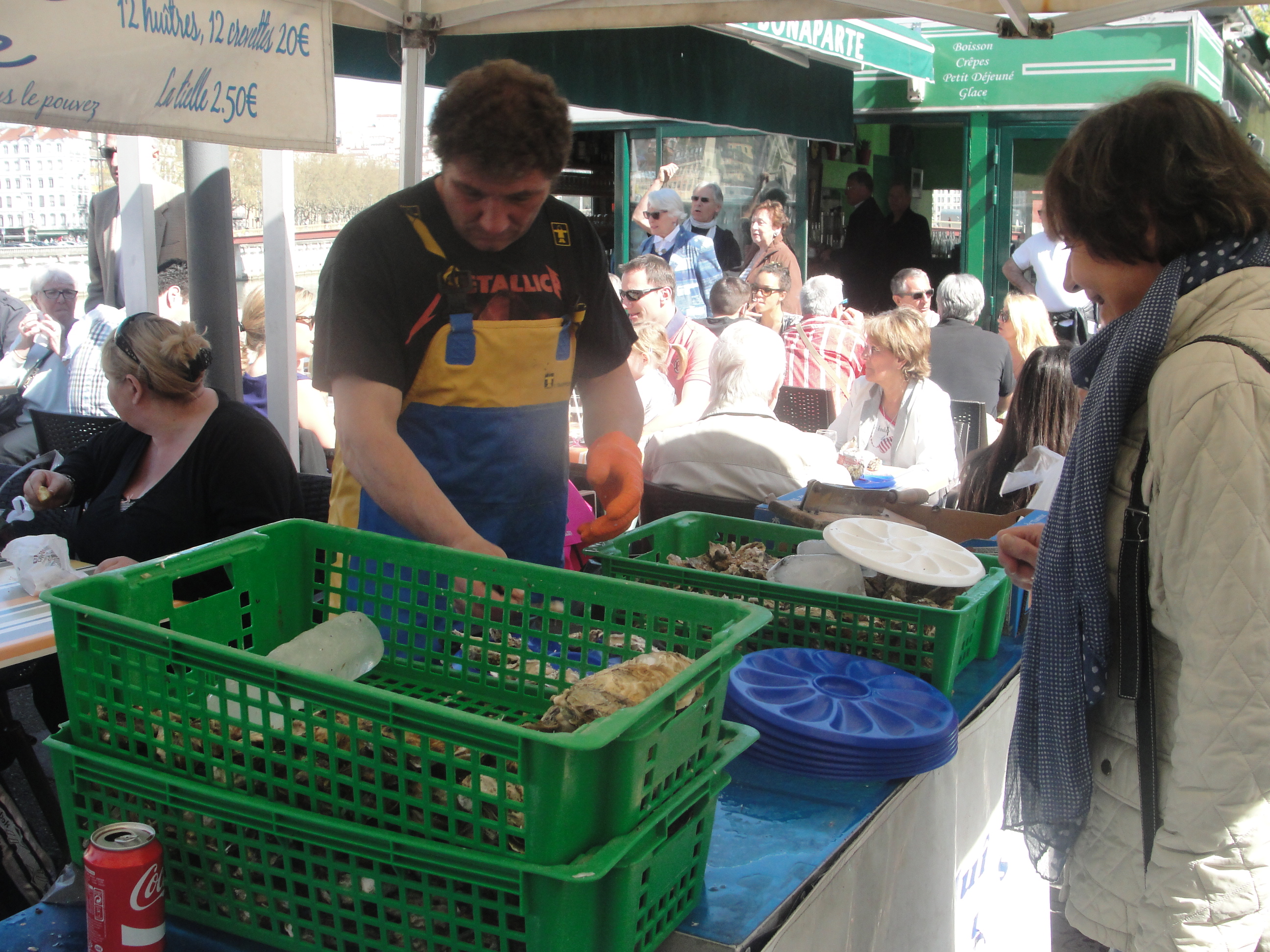 The market is a big social scene as well and the terraces of the two riverside cafés are packed, even in cold weather. Their specialty is fresh oysters and each week the oyster guy is out there shucking them as fast as he can as a steady stream of oysters and white wine make their way to almost every table. From these tables you have the perfect view of the market, the river and the two beautiful cathedrals and Renaissance buildings of Vieux-Lyon on the other side.