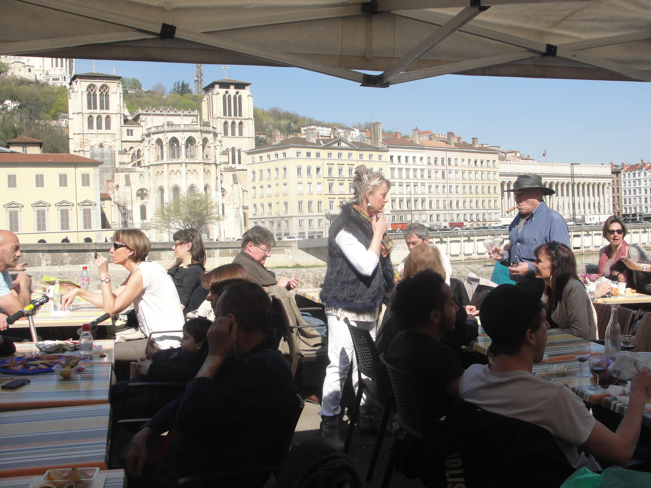 April 12, 2015, posted by Michelle – Just about every Sunday morning we go to the farmers market along the Saône river in downtown Lyon. One of the great things about Lyon is that there are farmers markets all over town every day. In my neighborhood there’s a mini farmers market every Tuesday morning just 50 feet from where I live. But with over one hundred vendors nothing compares to the quarter mile of gastronomic paradise that is the Sunday market. The selection is huge, the quality supreme and the setting idyllic, especially on sunny Sundays. There’s plenty of local produce, cheese (oh, the cheese!), pastries, breads, herbs, honey, wine, fruit juices, ciders, seafood, meat, chicken, sausages, nuts, olives and flowers but also Italian, North African, Chinese and Latin American specialties.