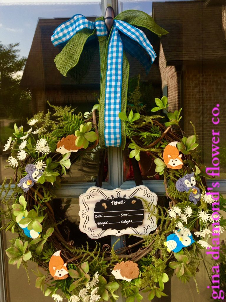 I created this whimsical wreath for a baby shower. The mom and dad-to-be had selected woodland creatures as the theme in their nursery. The hostess for the shower wanted a front door wreath that could be used at the hospital as well as in the baby’s nursery. Faux ferns, woodland creatures and a name plate complete this adorable wreath.