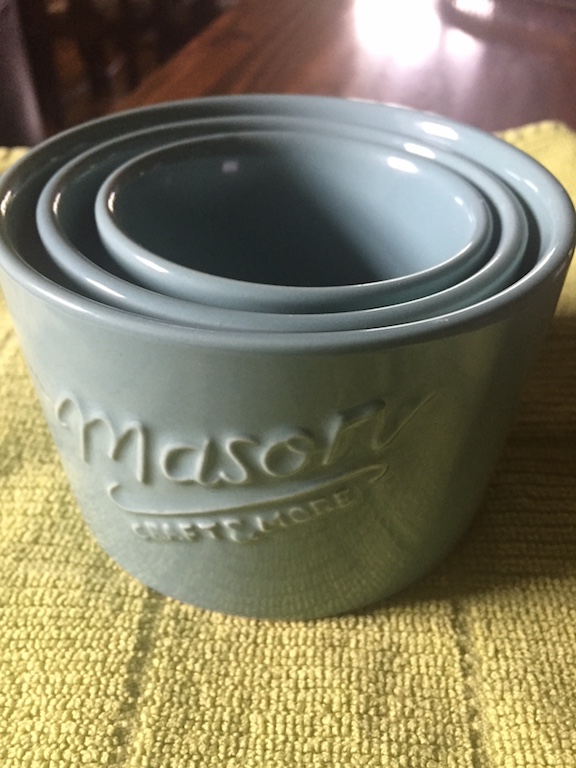 Ok, so they’re not jars but….I found this small set of Mason nesting bowls on a recent trip to the grocery store. Initially, I thought they were just so cute but as I started to think of all the potential uses for them, a few landed in my cart. The large bowl is perfect for mixing a dressing in and the best part is these are so attractive you can use them for serving as well. They would also be great for serving salsa or condiments. Here are the sizes: