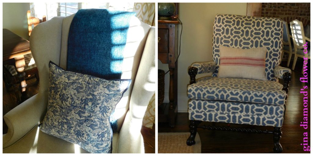 Chairs | We call this wing chair (left) the “reading” chair mostly because it is beside the fireplace and does not face the TV. This chair (right) had lived a long hard life when I found it. I think it was ready to be sent to pasture but the wood details on this chair were far superior to anything you would find today so basically we had this chair reworked with new fabric, stain and had an ottoman custom made to fit perfectly with it.