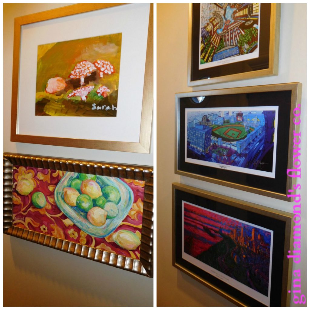 Paintings and Prints |Both of these paintings (left) came from people we know and that makes them very special to us. The colors are fun and the subject of mushrooms and lemons seems to fit perfectly in a kitchen. These prints (right) are from David Lynch who specializes in scenes from Memphis as well as the ever popular 30A. His distorted perspective and bright colors set these apart from typical city scenes. Take a look at his work on his website David Lynch Art.