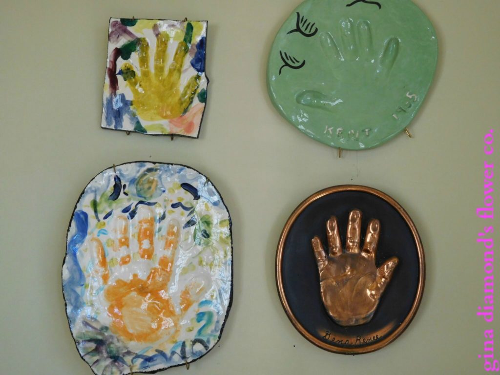 Hand Imprints | Each family member at some point had a permanent imprint of their hand made. Mine is the copper one and I remember doing it when I was five years old. Mr. GDFC’s is the green one and he was also five years old. I wonder if it had been a right of passage to have these made at five years old or if it is just a coincidence. The larger colorful one belongs to Son 1 and the smaller one belongs to Son 2. Son 1 was taking an art class and little brother joined in. Son 1 was 8 years old and little brother was 2. I love that we each have one of these.