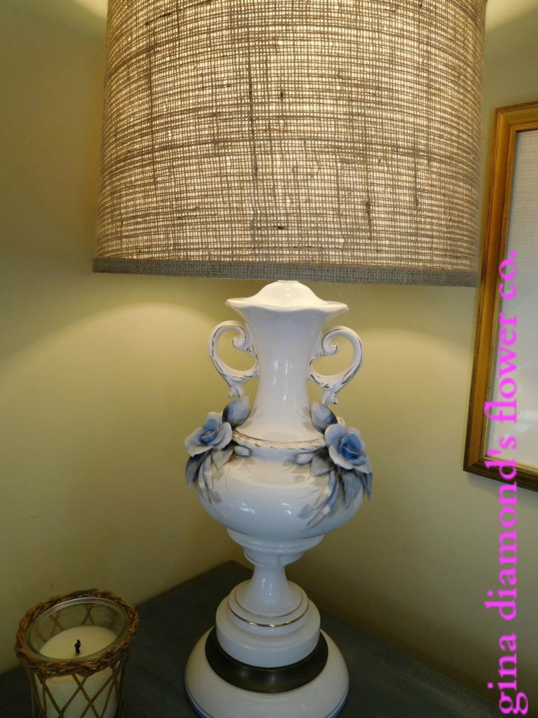 Lamp | This lamp is a true story of “one man’s trash is another ones treasure” . A friend of mine moved into a new house and found this beautiful porcelain lamp in the attic. Knowing my love of Blue & White she reluctantly asked if I wanted it. I could not get it out of her hands fast enough. The shade was torn and dated. I cleaned the lamp base up and found this burlap lamp shade which is a fun contrast to the porcelain.