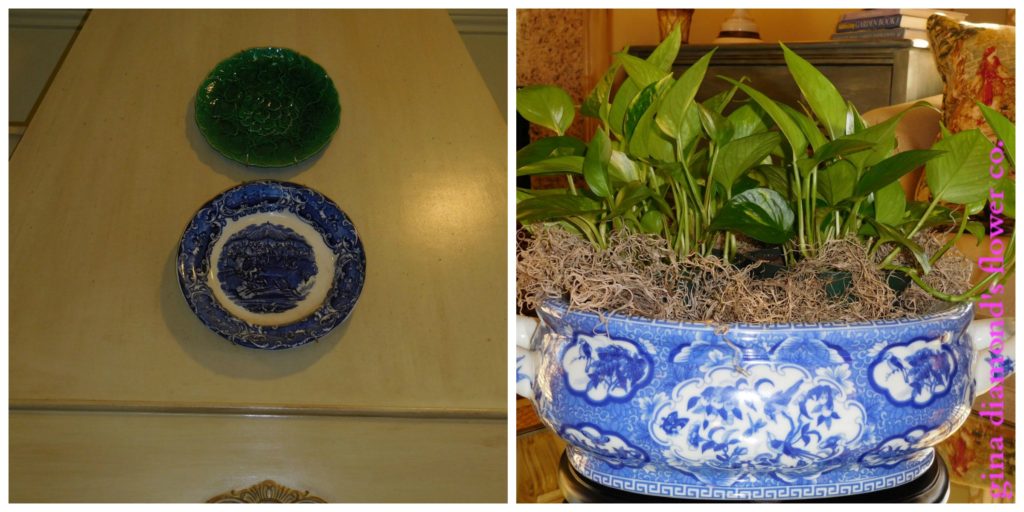 Majolica and Blue and White | This Majolica and Blue & White transfer-ware are two of my favorites. I love this Blue & White footbath and keep it filled with something green all year long