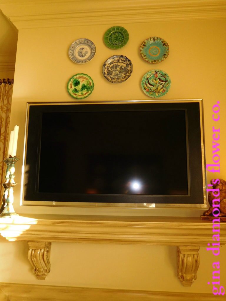 The TV | I fought having a television above the fireplace. I envisioned a lovely painting and stood firm in that decision until boys eventually won the battle and up the tv went. Now I can’t imagine the room without it. It keeps me company while cooking. I decided to place the Majolica plates above the television to give it some kind of decorative interest and pretty color. This collection makes me happy everytime I look at it.
