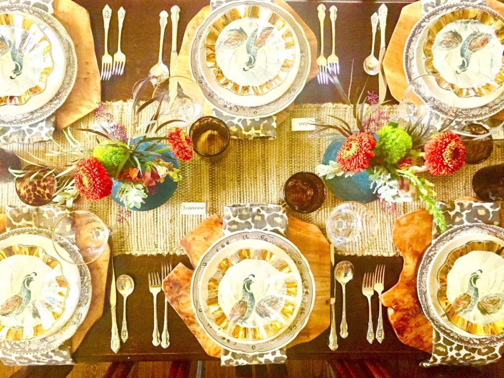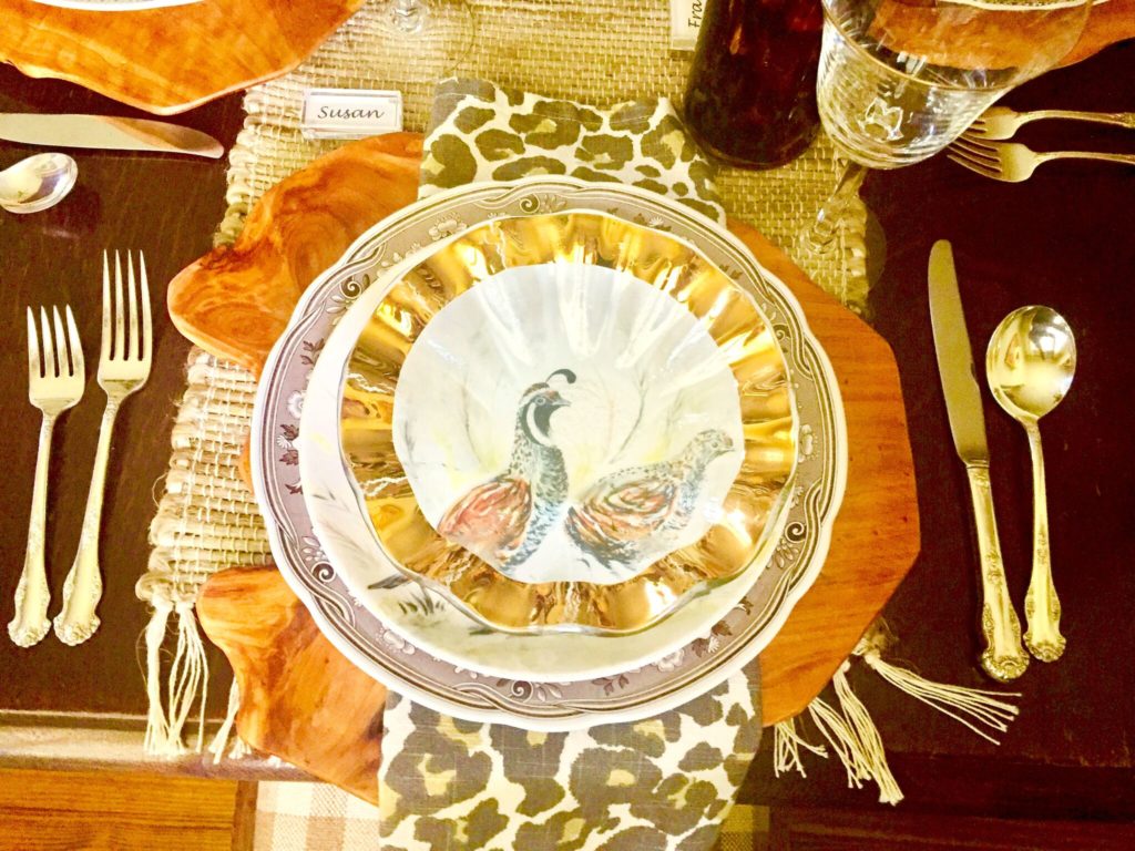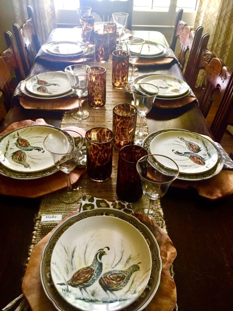 Next we added the plates and glasses. We used Spode brown and white as the base and layered it with a pheasant salad plate. The tortoise glasses complimented the brown and white plates and certainly says “Fall”. The pheasant salad plates are from Southern Living. Tortoise glasses are from Pier 1.